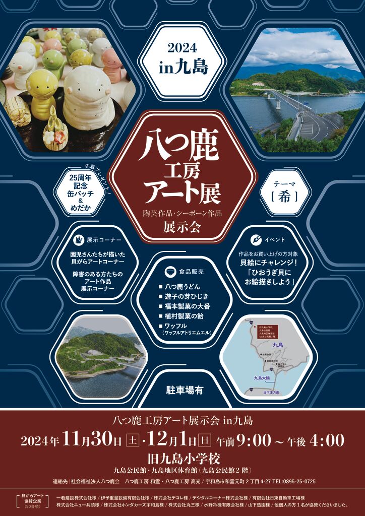 今年も、八つ鹿工房アート展を致します。 お陰様で、八つ鹿会は今年、25年周年を迎えます。 これもひとえに、地域の皆様、支えて頂いた皆様のお陰と、深く感謝しております。 これからも八つ鹿工房、地域に愛される施設となるよう努めてまいります、よろしくお願い致します。 今回は、九島の小学校跡という地での開催となり、新しい取り組みをしたいと、みんなで企画を絞っております。 楽しい週末になること間違いなしです。ぜひ、ドライブがてら、寄ってみてください。 九島の橋を通り道なりに進んでいただくとクルッと宇和島から向かって左側に...